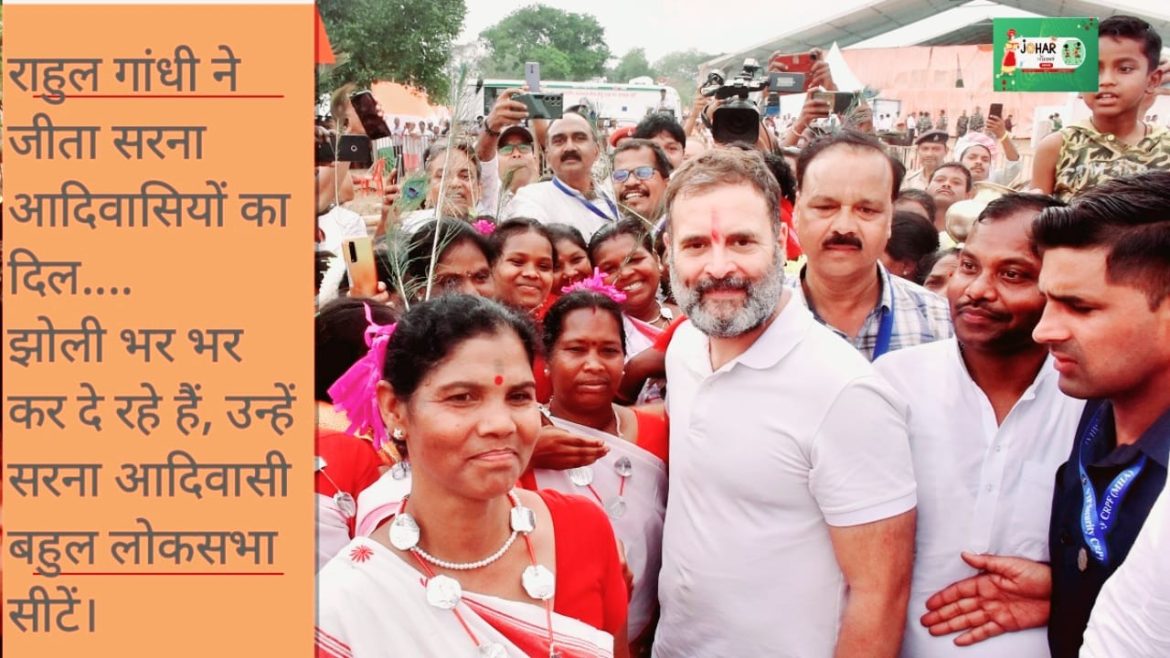 इंडिया गठबंधन के प्रधानमंत्री उम्मीदवार राहुल गांधी के झारखंड के बसिया, गुमला में इंडिया गठबंधन के सरकार बनते ही सरना धर्म कोड लागू करेंगे की उद्घोषणा करके जीता आदिवासियों का दिल और झारखंड के… लोहरदगा,खूंटी,जमशेदपुर, चाईबासा,दूमका,राजमहल, पलामू हजारीबाग व गिरिडीह। उड़ीसा के.. सुंदरगढ़, मयूरभंज। पश्चिम बंगाल के…. अलीपुरद्वार,मालदा। छत्तीसगढ़ के जशपुर व सरगुजा । के आदिवासी आरक्षित व बहुल लोकसभा क्षेत्र के बादली चुनावी समीकरण। सामाजिक कार्यकर्ता, लेखक, चिंतक व राजी पाड़ाह सरना प्रार्थना सभा,भारत की केंद्रीय प्रवक्ता संजय पाहन का कहना है, राहुल गांधी की उद्घोषणा व संस्था के केंद्रीय अध्यक्ष धर्म गुरु बंधन तिग्गा का देशहित समाजहित में देश के सरना मतदाताओं को इंडिया गठबंधन को समर्थन देने की भावभीनी अपील के बाद इन लोक सभा क्षेत्र में विभिन्न सरना आदिवासी संगठनों के लाखों कार्यकर्ताओं द्वारा इन क्षेत्रों के सुदूर गांव कस्बों में युद्ध स्तर पर छोटे-छोटे बैठक सभा सेमिनार आयोजित कर जनसंपर्क कार्यक्रम चलाया जा रहे हैं।जिससे सरना आदिवासी समाज इंडिया गठबंधन के पक्ष में गोलबंद हो चुकी है और सरना धर्मकोड की निर्णायक लड़ाई जितने हेतु मतदान करने का निर्णय ले चुकी है।